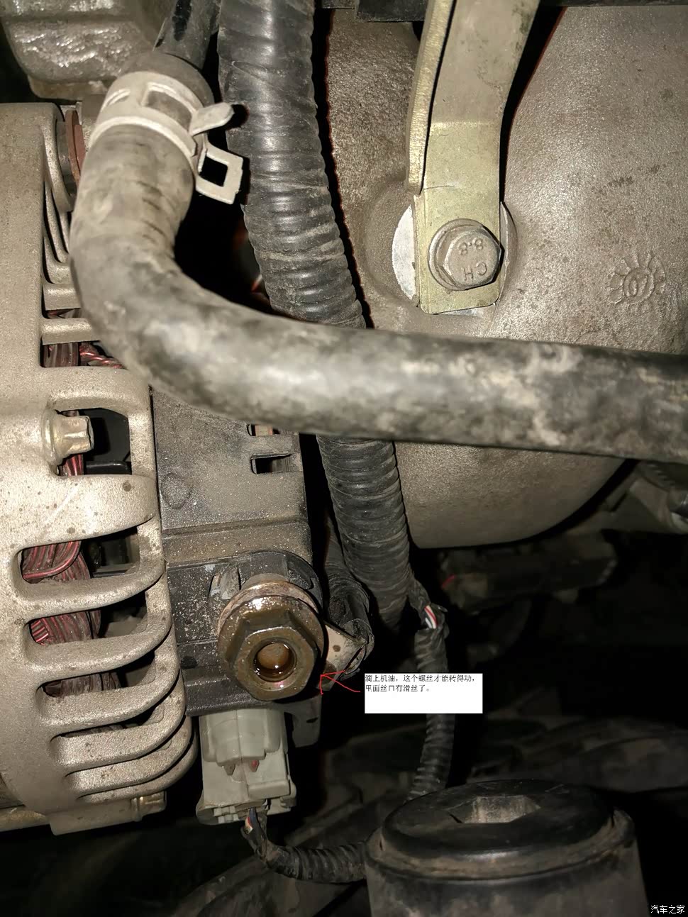 由于螺帽有些滑丝,根本转动,于是,又灵机动,从旁边机油尺处把机油尺扯出来,滴了几滴机油在螺帽面,再停松,紧,这样反复几次,总算可以把螺帽松下来了,将桩头金属碎物清理干净,在丝口滴了几滴机油,重新装了去。这下子紧了。